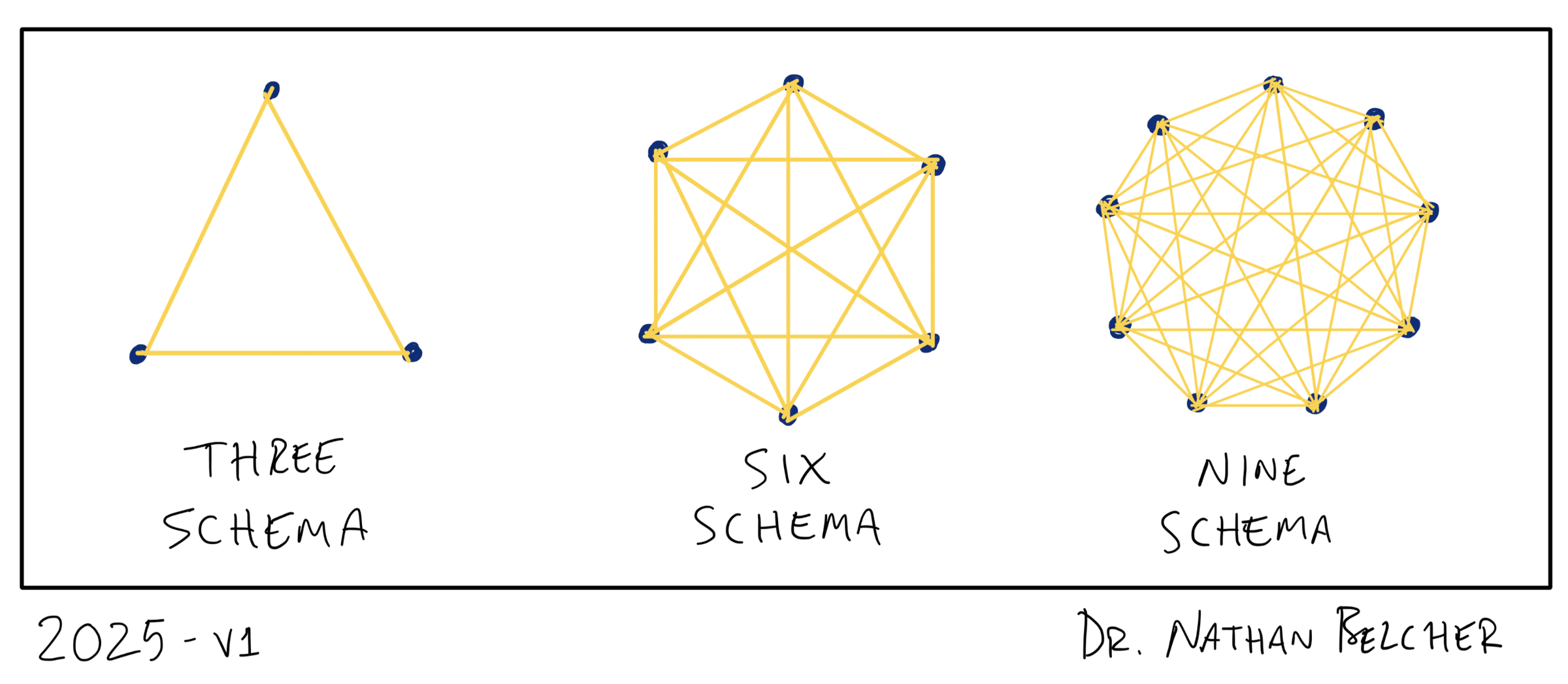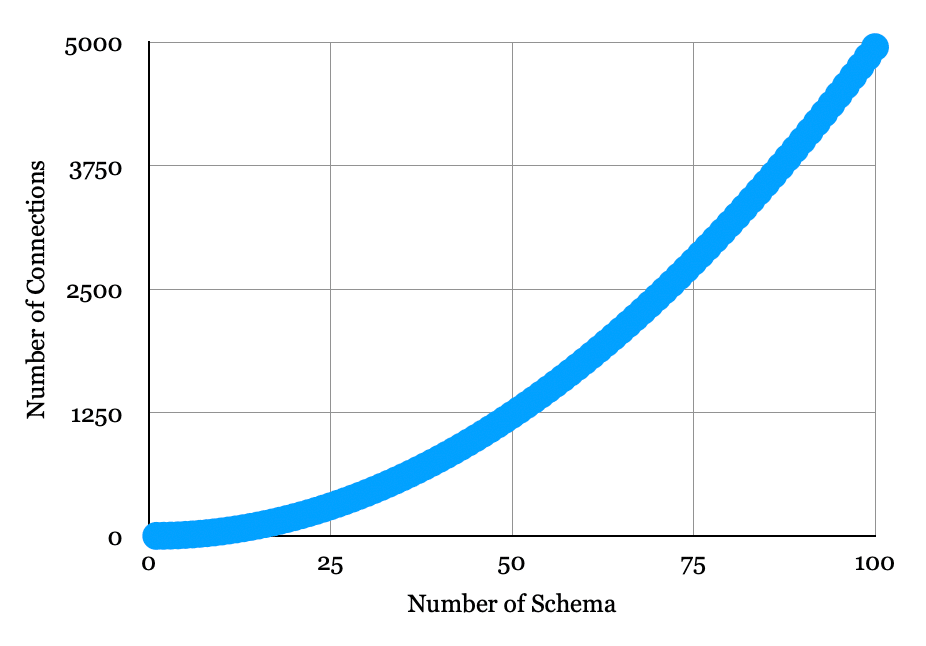 To illustrate this point, the image below show the schema (represented by the black dots) and the connections between each schema. Without knowing what happens to the number of connections we might naïvely expect to see a one-to-one relationship, but going from three schema to nine schema shows a massive difference in the number of connections!